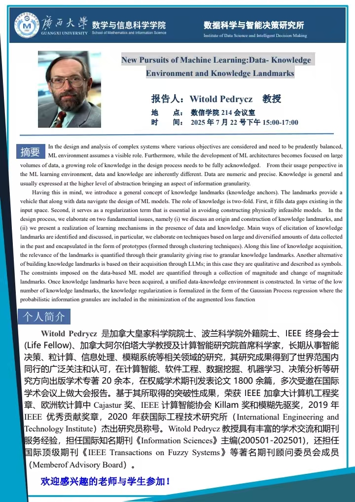 学术报告:New Pursuits of Machine Learning:Data- Knowledge Environment and Knowledge Landmarks