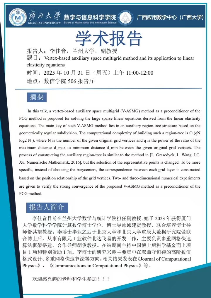 学术报告:Vertex-based auxiliary space multigrid method and its application to linearelasticity equations