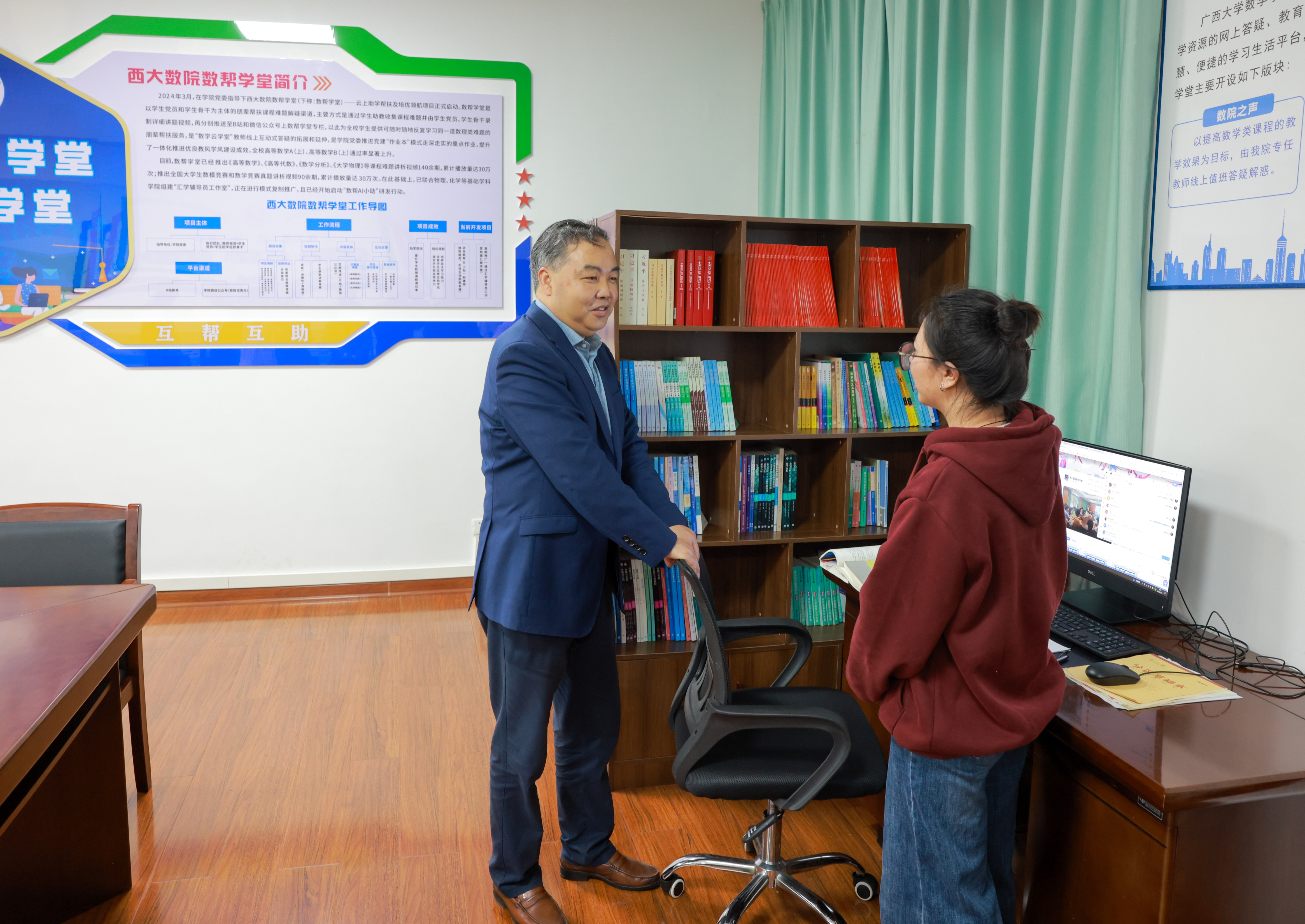 座谈会前,肖建庄参观指导了新葡萄官网“数学云学堂”和“数帮学堂”,听取“数帮学堂”负责人介绍项目推进和学业帮扶开展情况,与值班答疑的研究生助教亲切交谈,对“数帮学堂”建设提出了具体指导意见。