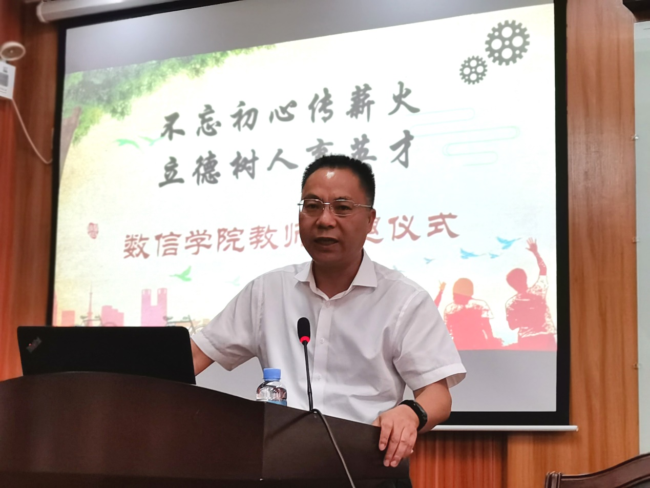 峥嵘岁月话感恩,砥砺前行献余热。学院党委书记黄建荣为荣退教师颁发纪念品、敬献鲜花并作了讲话。他指出,三位教师对从教经历的回顾,体现出了她们对教师这个岗位的深刻认知和深入解读,令人深受教育。她们字里行间的感恩之情和对学院及师生的祝福,也折射出身为一名教师“德高为师,身正为范”的良好修养。同时,学院在人才培养、学科建设和社会服务等方面的每一次变化,每一步发展,都离不开每一位老师汗水和智慧的付出。黄建荣书记强调,大爱无疆,是数信老师最美的本质;艰苦奋斗,是数信老师最纯的本色;求真务实,是数信老师最难得的本真。这些都已融进了数信精神的内涵之中,激励着每一位数信人砥砺前行。最后,黄建荣书记希望三位退休教师能科学、健康地安排好退休后的生活,拥有美好的荣退时光;希望她们能够“退休不退志,离岗不离心”,继续关心和支持学院的工作,为立德树人发挥余热;数信学院是她们永远的家,也希望她们退休以后能够常回家看看。